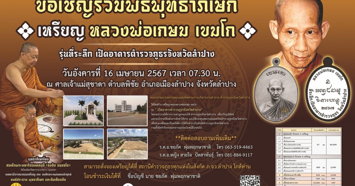 ขอเชิญร่วมพิธีพุทธาภิเษก เหรียญ หลวงพ่อเกษม เขมโก รุ่นที่ระลึก เปิดอาคารตำรวจภูธรจังหวัดลำปาง วันอังคารที่ 16 เมษายน 2567 เวลา 07.30 น. ณ ศาลเจ้าแม่สุชาดา ตำบลพิชัย อำเภอเมืองลำปาง จังหวัดลำปาง