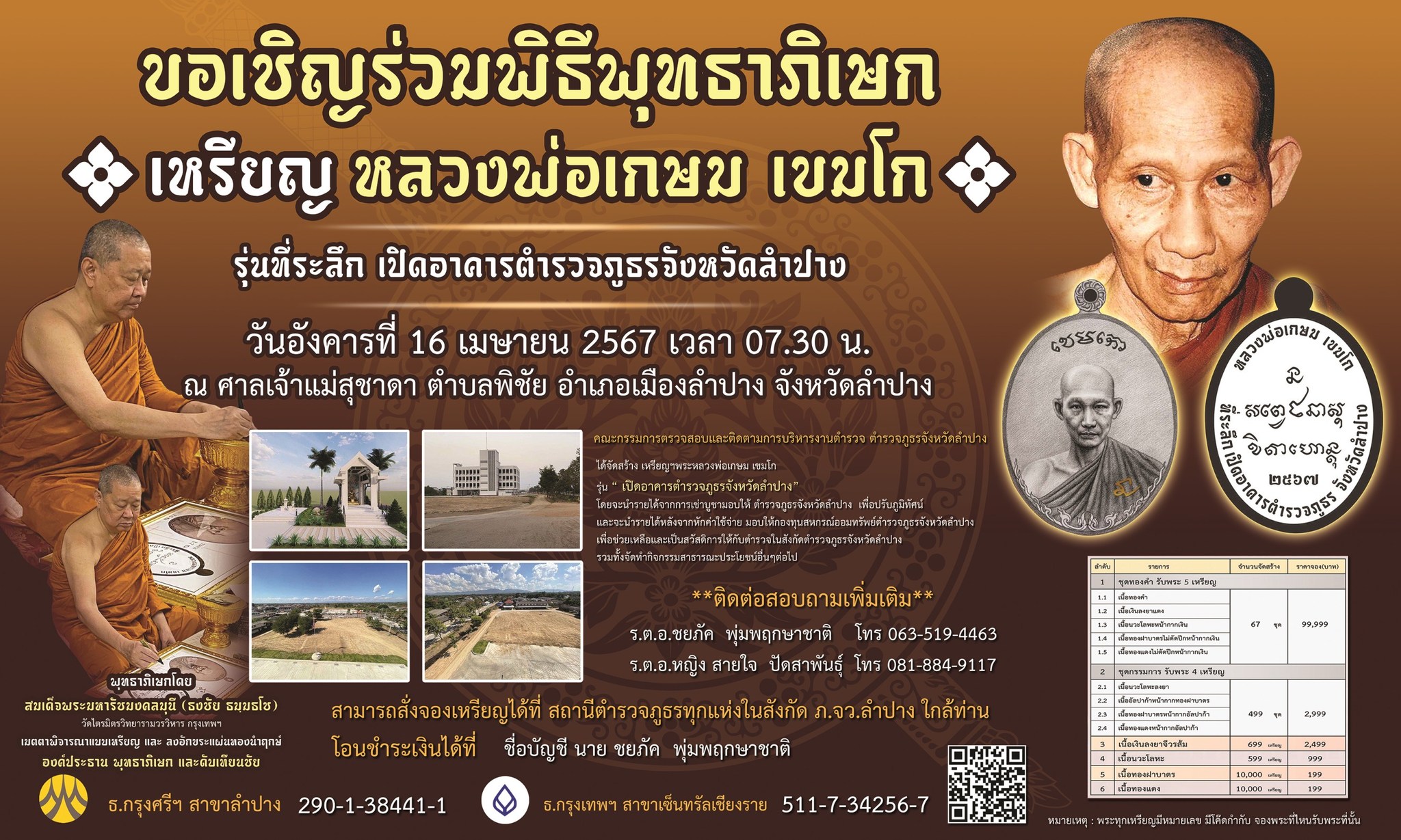 ขอเชิญร่วมพิธีพุทธาภิเษก เหรียญ หลวงพ่อเกษม เขมโก รุ่นที่ระลึก เปิดอาคารตำรวจภูธรจังหวัดลำปาง วันอัง